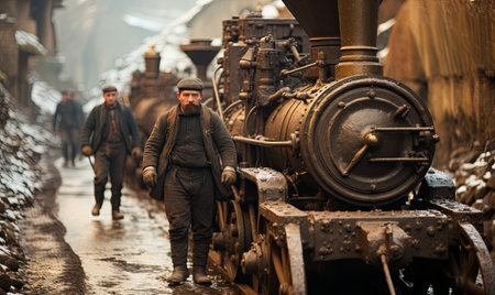 Train engineer team working service maintenance old dirty vintage classic steam engine locomotive in train repair workshop at train station.
