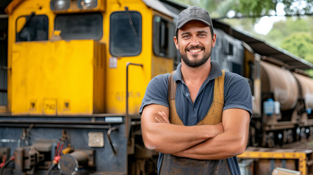 Cheerful bearded train engineer standing with arms crossed in front of locomotive