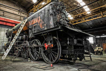 Train engineer team working service maintenance old dirty vintage classic steam engine locomotive in train repair workshop at train station.