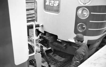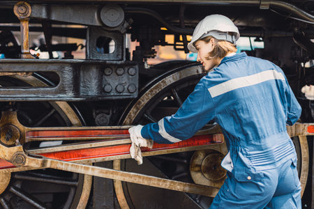 Locomotive repair worker, Train Engineer technician on duty working Maintenance Rolling Stocks of old diesel train passenger cabin in rail transport industry