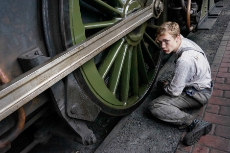 Young man cleaning a steam train wheel