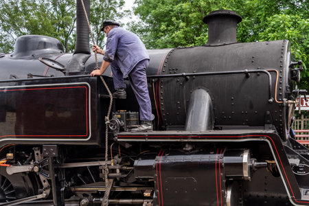 Sheffield Park East Sussex, UK - July 13 2022 : Filling locomotive 80151 with 3000 gallons of water in Sheffield Park station on July 13, 2022. One unidentified man