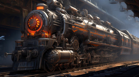 Active engineers in a busy train workshop, generative AI