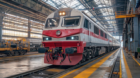 A striking view of a modern train inside an expansive industrial station. The sleek locomotive stands ready on the tracks, surrounded by a high-tech setting.