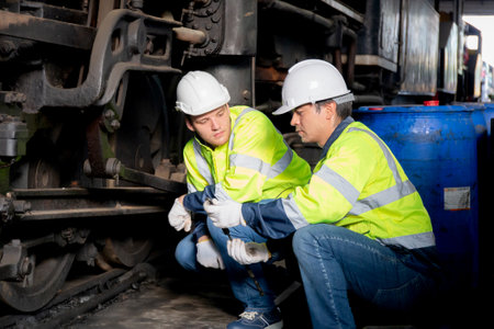 Young caucasian engineer man maintenance and repair train diesel engine in station, team engineer inspect system transport, technician checking infrastructure, transportation and industry.