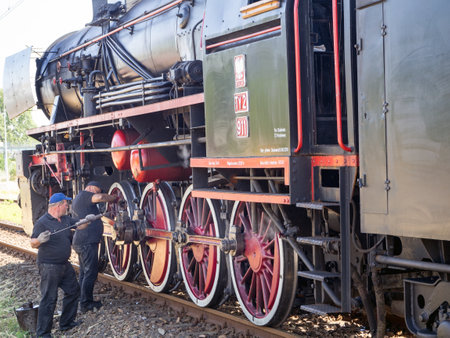 WADOWICE RAILWAY STATION, POLAND – JUNE 29, 2019, - steam locomotive PKP classes Ty2 during oiling.