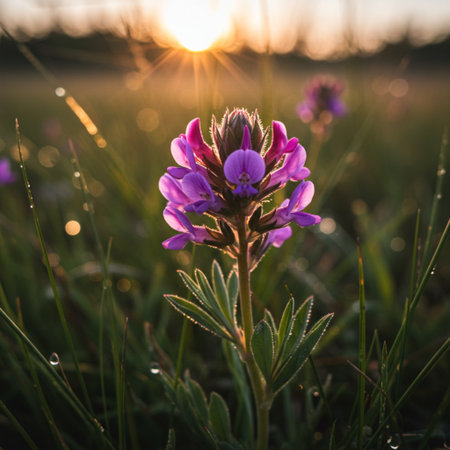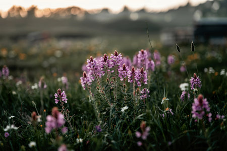 A cluster of vibrant purple wildflowers stands out in a field of green grass and other wildflowers, bathed in the soft light of a setting sun.