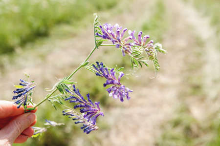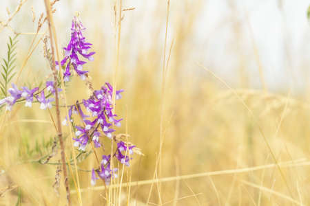 Purple vicia cracca blooming flowers in summer field in sunset light. Slow living, summer in countryside. Atmospheric tranquil moment. Winter vetch