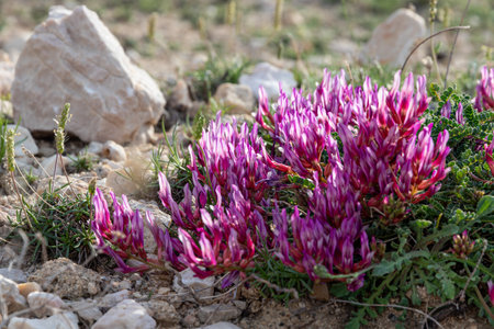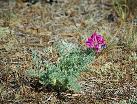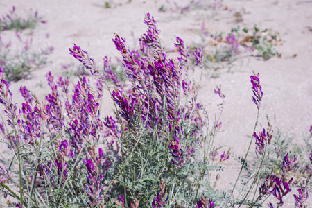 purple astragalus flowers in blooming spring desert, Sarykum sand dune
