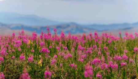 Scenic Panoramic Landscape with Blooming Fireweed Flowers