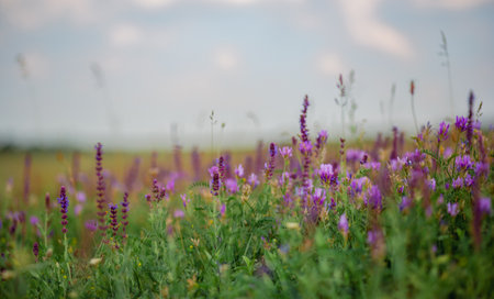 beautiful wild purple flowers at sunset, close up. Spring farm field landscape. Floral background.