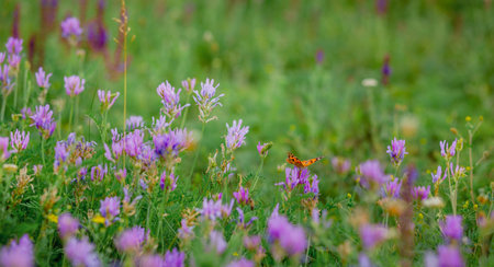 meadow clover purple flowers growing in a sunny field.