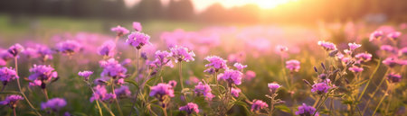 Verbena Field On Blurred Sunrise Background. banner for web