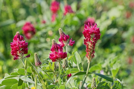 Close up view of Sulla coronaria flower. Agricultural plant are grown for animal feed and to collect honey, mainly growing in Malta, Spain and southern Italy