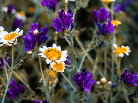 Close up of beautiful purple and yellow flowers in the field at sunset