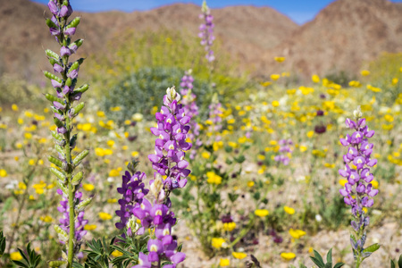 Lupine flowers; Field of wildflowers in the background, south Joshua Tree National Park, California