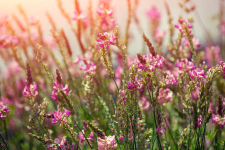 Field of Pink flowers Sainfoin, Onobrychis viciifolia. Wildflowers background. Farming concept. Blossoming Sainfoin or Holy-clover wildflowers. Selective focus