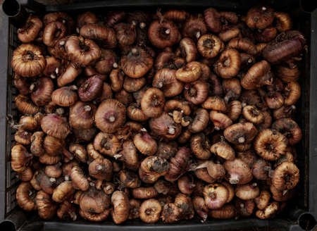 Tubers of a flower of gladioulos in boxes for preservation for planting in the ground in spring