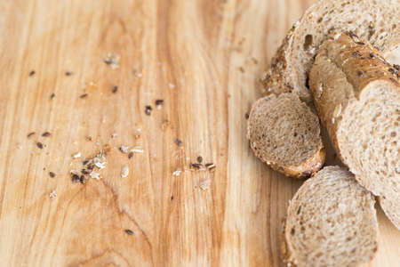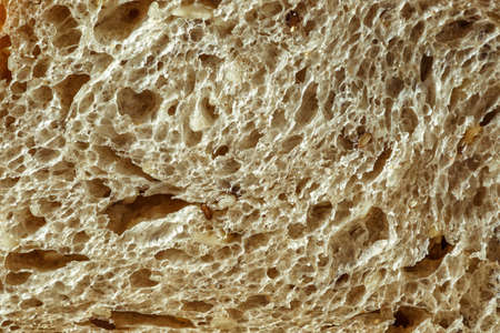 Fresh whole grain seeded bread, organic wheat flour, closeup slice texture as background for food blog or cook book recipes