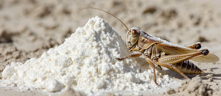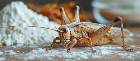 Cricket - Gryllus assimilis - feeding insects on flour background, organic food of future. Source of protein. Entomophagy concept, banner, copy space