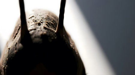 a close-up of a large brown insect captured with a canon eos 5d mark iv camera. the photo showcases realistic chiaroscuro lighting, highlighting the intricate details of the plastic insect. the insect is adorned with light orange and light gold colors, resembling wood and hopi art. ai generated