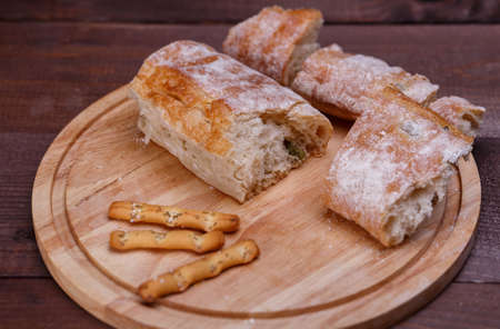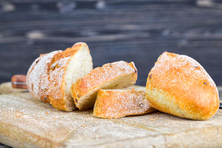 fresh and warm bread products made from wheat flour, close-up on the cutting Board of delicious bread