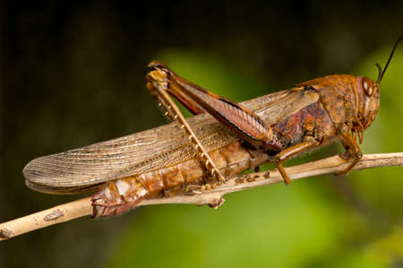 Detailled macro of an adult brown,Egyptian,Grasshopper, Anacridium aegyptium, very similar to a locust, with a green leaf background. Central Spain in late summer.