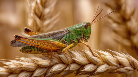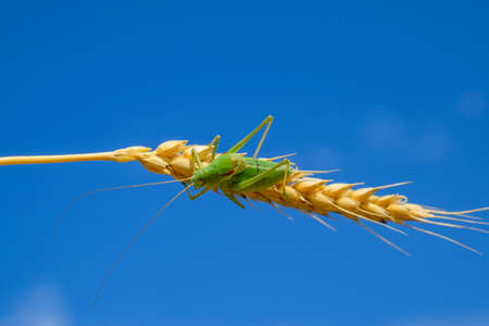 Image of grasshopper on wheat ear over nature background. Insect Animal