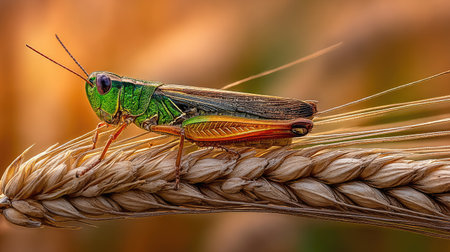 This stunning close-up photograph of a grasshopper reveals intricate details and textures of its body, showcasing the beauty of the insect world.