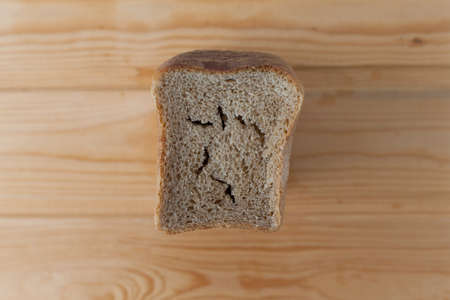 warm, freshly rye bread. Cut the slices. Tear off a piece. top view. Farm food made from flour and eggs.