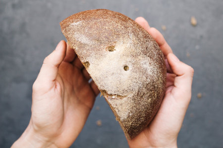 Baker holding organic bread bake bread rolls divided in half in hands - rural bakery, moody still life.