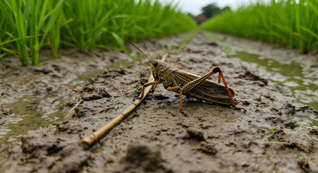 Grasshopper on rice field in rainy season, Thailand.