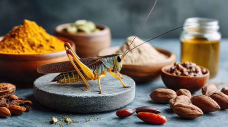 The Kuruma batta (Gastrimargus marmoratus) Bush with a locust, captured in close up macro. Generative AI
