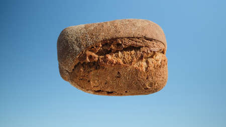 Loaf in air on background of blue sky. Homemade baking concept. Fresh baked bread on sky background. Harvest in village concept. Flying bread. Loaf of bread in sky.