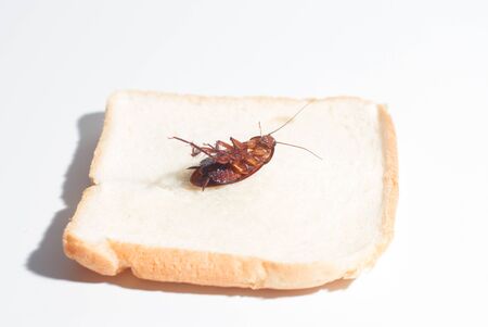 Madagascar hissing cockroach near bread isolated on white background with copy place