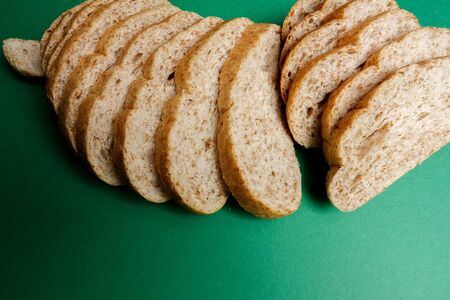 Slices of brown bread on a green background close-up
