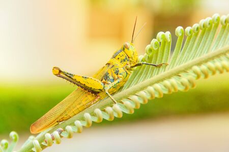 grasshopper yellow on branch of trees with copy space add text select focus with shallow depth of field.