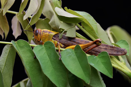Locust grasshopper (Acrididae) sitting on a healthy green leaf in terrarium