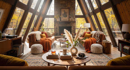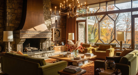 A cozy living room with a stone fireplace, decorated with autumn flowers and plants, large windows showcasing fall foliage outside, warm lighting