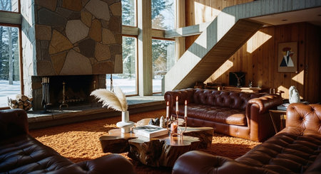 A cozy mid-century modern living room with large windows, showcasing a snowy landscape outside. The room features a stone fireplace, colorful abstract art on the walls, and vintage furniture.