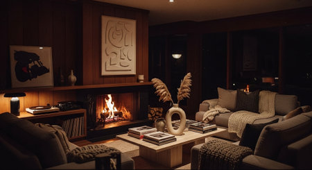 A cozy living room with warm autumn colors, featuring a modern fireplace, plush sofas, and a decorative coffee table adorned with flowers and books