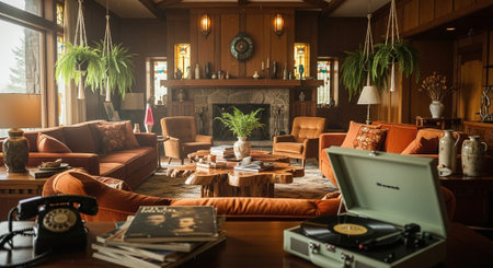A cozy living room featuring vintage decor, orange sofas, a stone fireplace, and a record player with vinyl records