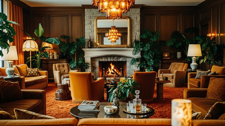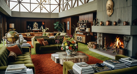 A stylish mid-century modern living room featuring a cozy orange sectional sofa, green couches, and a large fireplace. The decor includes various ceramic vases, indoor plants, and warm lighting.