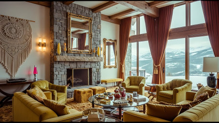 A stylish living room with large windows showcasing a mountain view, featuring modern furniture, warm autumn colors, and decorative plants