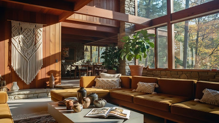 A cozy living room featuring a stone fireplace, large windows, and wooden beams. The space is decorated with macrame wall hangings, warm-toned furniture, and various decorative vases and plants.