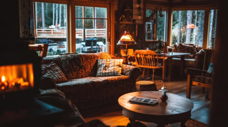 Interior of a cozy living room with a fireplace in a winter forest