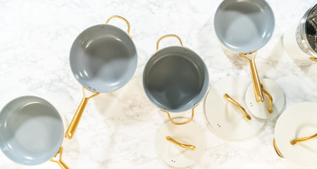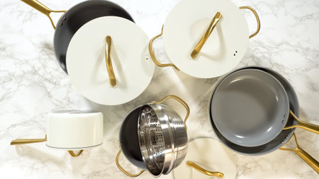 Set of cookware utensils on a kitchen counter