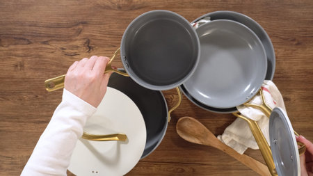 Overhead view of a person holding a grey saucepan over a matching cookware set on a wooden surface. The lid and cooking tools are arranged neatly beside the pots.