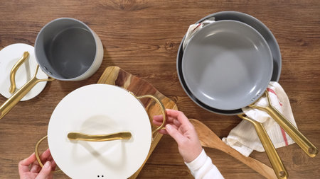 An overhead view of hands placing a lid on a pot as part of a modern cookware set. The clean wooden background contrasts with the gold-accented pots and utensils nearby.