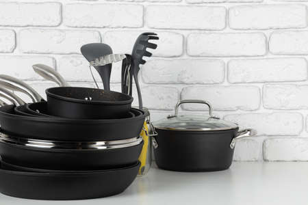 Black kitchenware on white brick wall texture background, view from front table.